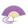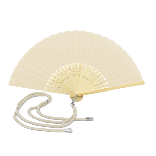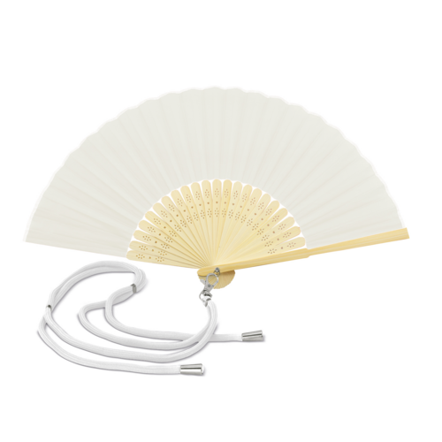 Abanico fabricado en bambú y poliéster, incluye cuerda ajustable para poder llevar colgado de forma cómoda.