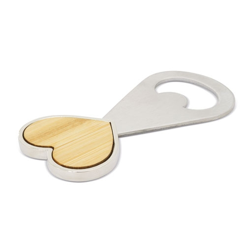 Abrebotellas fabricado en acero inoxidable, con agarre en forma de corazón realizado en bambú.