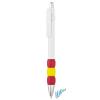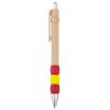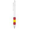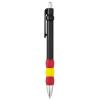 Bolígrafo de plastico con detalle de bandera España en la empuñadura y mecanismo giratorio antiestrés en la parte superior.
