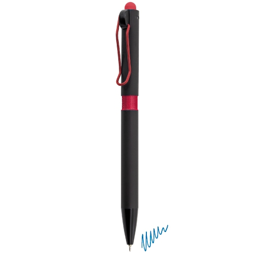 Bolígrafo metálico con textura soft effect, cuerpo de goma negra y clip metálico, con puntero touch para pantallas. La técnica de grabación a láser deja un acabado brilloespejo con el color a juego del touch.