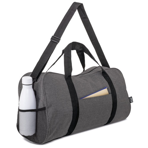 Bolsa de deporte fabricado con materiales reciclados. Incluye maya portabotellas, un práctico bolsillo interior con cremallera, y otro en el exterior.
