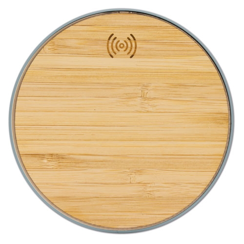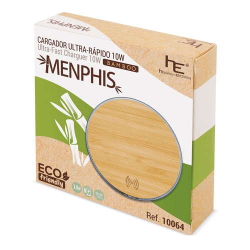 Cargador inalámbrico fabricado en bambú, capacidad 10W, conector tipo C.