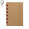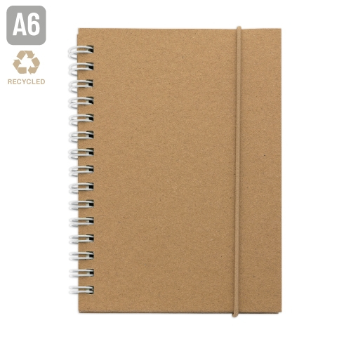 Bloc de notas tamaño A6 (10x15cm) de 70 hojas con lineas, fabricado en cartón. Incluye una goma elástica para mantenerla cerrada.