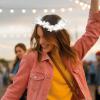 Diadema floral fabricada en poliéster y flores artificiales con luces LED. Dispone de 3 modos de iluminación ajustables facilmente con un click: parpadeo rápido, parpadeo lento, y luz constante.