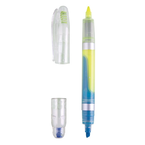 Marcador de plastico doble, con subrayador naranja y amarillo.