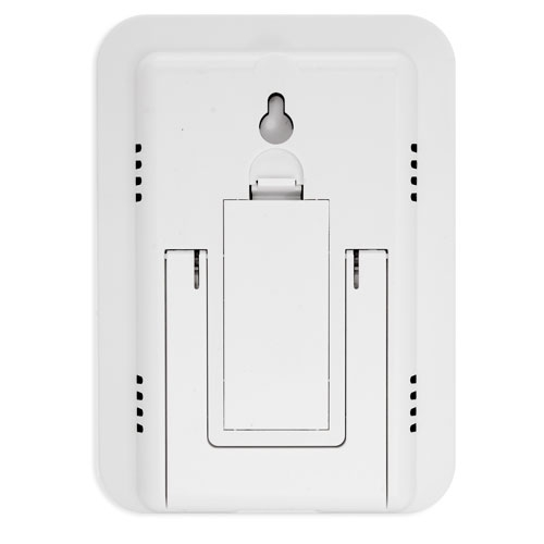 Reloj con termometro incorporado fabricado en bambú, con teclas táctiles. Con soporte de mesa para colgar en pared.