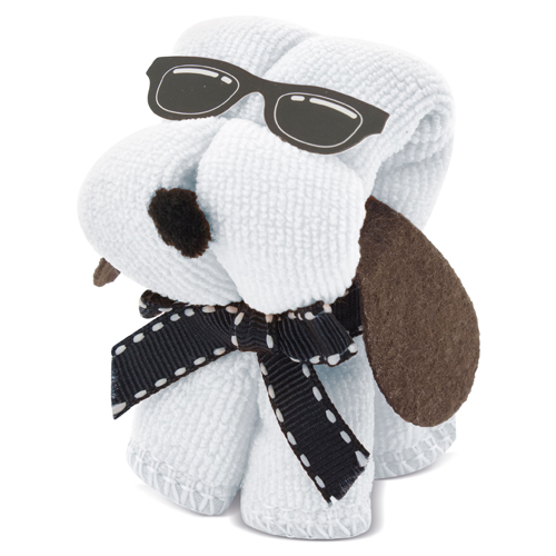 Toalla de microfibra con forma de perro disponible en varios colores. Se sirve en caja de presentación transparente.