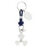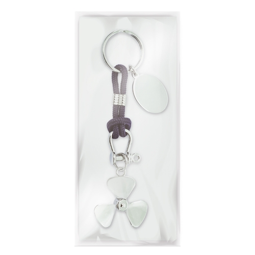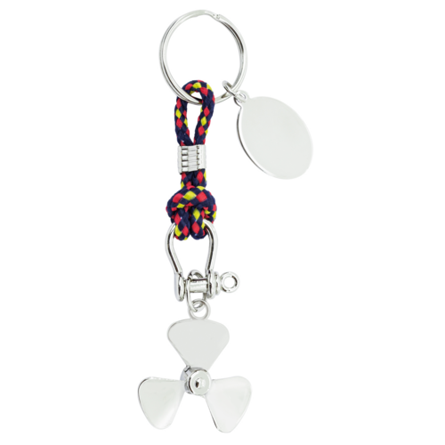 Llavero metálico con forma de hélice marinera, enlazado a cuerda en azul o con detalles de bandera de España. Incluye una chapa metálica para grabación a laser.
