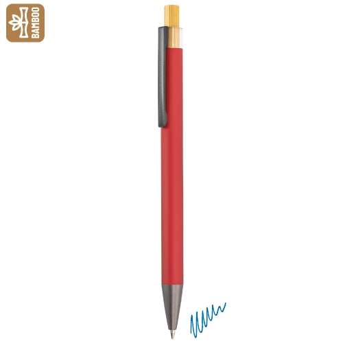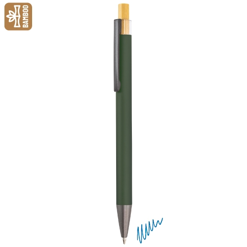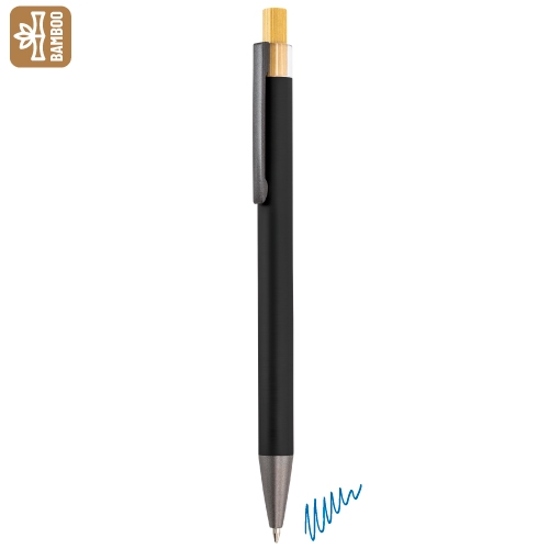 Bolígrafo con cuerpo de aluminio en acabado mate y pulsador de bambú natural. Combina estilo moderno y materiales eco, ideal para destacar con un detalle útil y sostenible. Escritura azul.